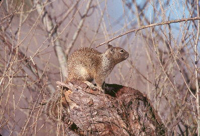 The California ground squirrel can be found in open areas including fields, pastures and lightly wooded areas.
