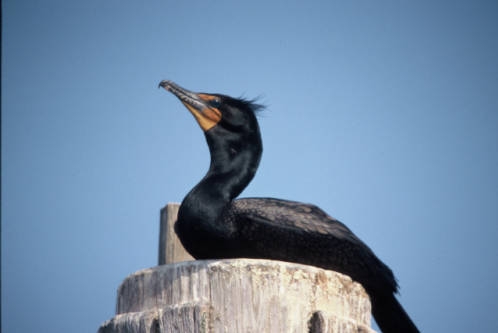 The double-crested cormorant is a little more than two feet long with a wingspan of about four feet. It has dark brown to black feathers, a long hooked bill with an orange throat pouch, a long tail, and webbed black feet. Adults have tufts of feathers over their eyes.