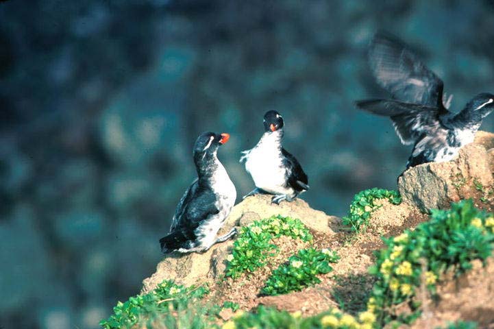The parakeet auklet nests on island coasts and cliffs.