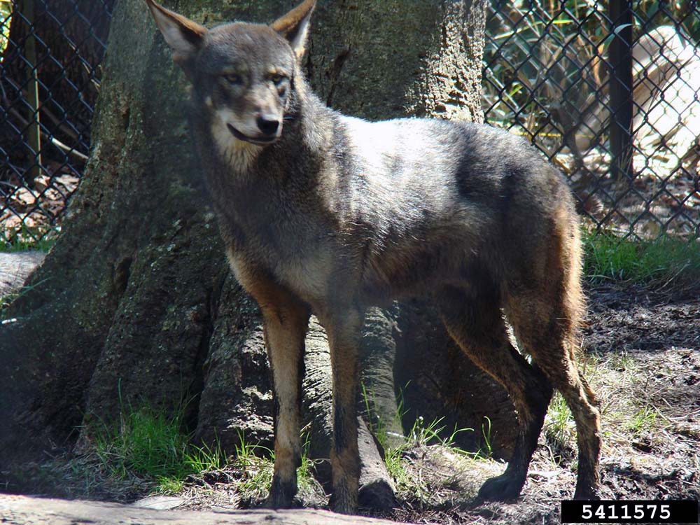 The red wolf has gray or black fur mixed with red, especially on its legs and sides. Ot has a long snout and a long, black-tipped tail. It is larger than a coyote and smaller than a gray wolf.