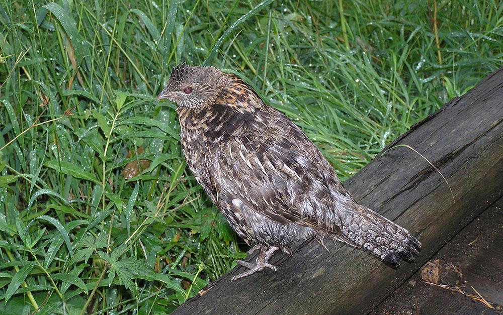 The ruffed grouse is a chicken-sized bird about 16-19 inches in length. It has reddish-brown to gray-brown plumage and a short crest on its head. It has barred flanks and a black ruff around its neck. It has a short, pointed bill and a long, square, flat tail.