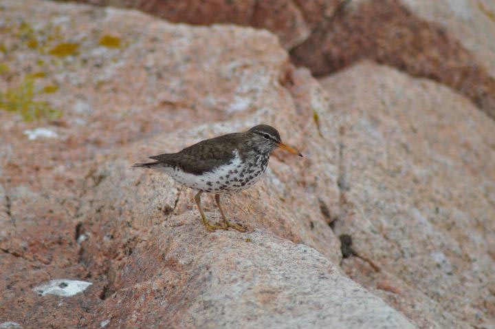 The spotted sandpiper is about six to seven inches in length. It has a white line over its eyes and long yellowish or pinkish legs.In breeding season, it is brown above and white below with dark brown spots on its chest and belly. Its bill is a bright orange with a black tip.