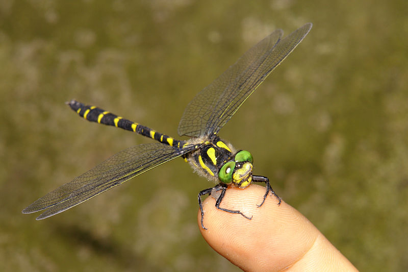 Spiketails have wide heads and clear to smoky black wings. They are brown or black with yellow markings. They have large green or blue eyes that meet on the top of their heads. |