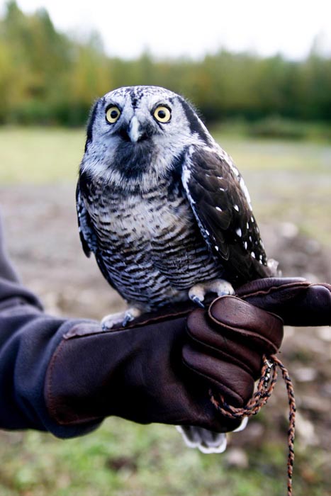 Hunting during the day and night, the Northern Hawk Owl preys on small mammals like voles, lemmings, snowshoe hairs and squirrels. In the summer, the owl eats rodents. In the winter, the Northern Hawk Owl sometimes eats ptarmigan and grouse.