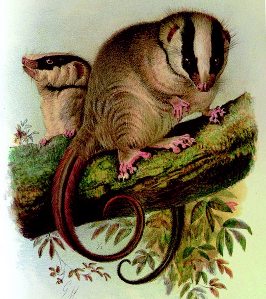 The feather-tailed possum is a very small marsupial found in forested areas of Indonesia and Papua New Guinea. It has gray fur and a black mask over its eyes and a white stripe on its forehead and cheeks.