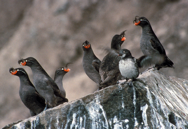 The parakeet auklet breeds on Bering Sea islands and nearby coasts.