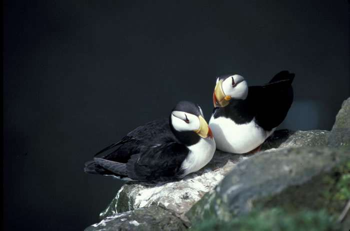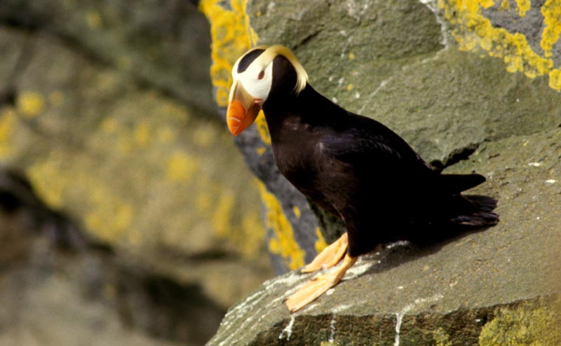 The horned puffin nests in rock crevices and cliffs.