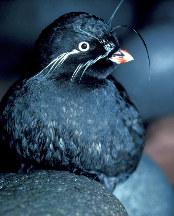 Breeding adult whiskered auklets have ornge bills and white feathers that look like whiskers on their faces.