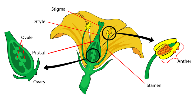 Tawny Day LilyAngiosperms have to undergo a process called pollination before they can reproduce. Angiosperms have male sex organs called stamens. On the end of the stamen is the anther. This is where pollen is made. The pollen has to be taken to the pistil, or the female part of the flower. The pollen is left on the stigma at the end of the pistil. The stigma carries the pollen down a tube called the style to the ovary.