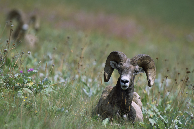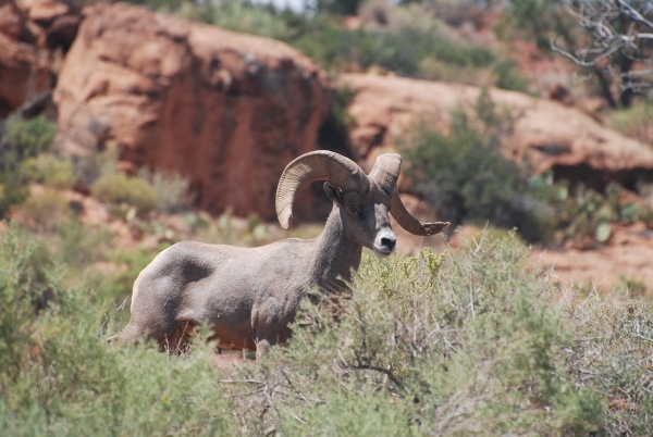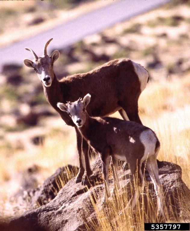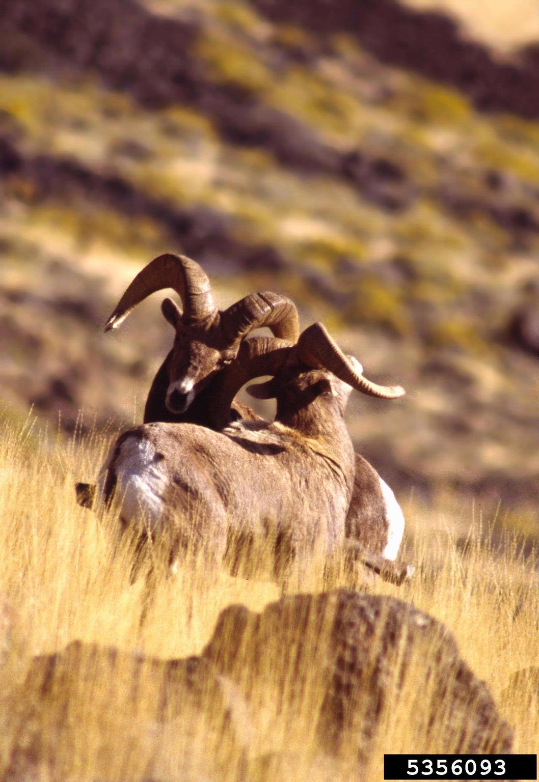 The bighorn sheep browses on grasses, clover, and sedges in warm months. In colder months, it eats woody plants like willow and sage. Bighorn sheep in desert areas often eat brushy plants like holly and cactus. When it is not grazing, it lies down and chews its cud. | |