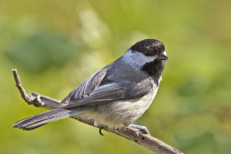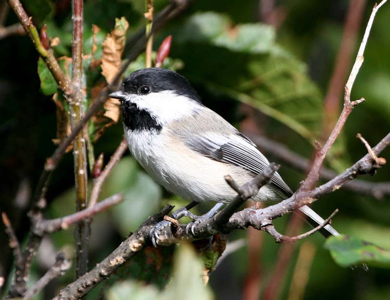The black-capped chickadee is four to five inches in length with a wingspan of six to seven inches. It is gray on its uppersides and tail and has a black cap and throat bib, white cheeks, a white chest and belly, and light brown flanks right below its wings. The chickadee is named for its "chick-a-dee-dee-dee" call. Slight changes in its call are used to claim territory, to warn of predators, and to greet other chickadees. Males and females look alike.