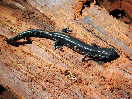blue-spotted salamanderThe blue-spotted salamander is a slender salamander, three to five inches in length, with a long tail. It is gray to blue -black with blue spots on its sides, tail, and legs. Its belly is lighter than its back. It has four toes on its front feet and five toes on its rear feet. It has 12 costal grooves (vertical grooves) on its body.