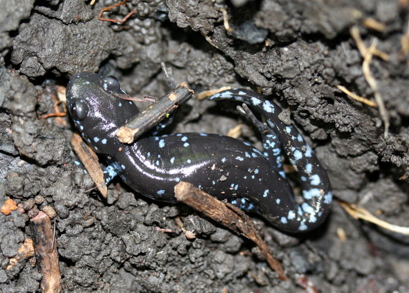 blue-spotted salamanderIn early spring, the blue-spotted salamander migrates to vernal ponds. Males arrive first. Vernal ponds make good breeding grounds. Vernal ponds are temporary ponds that form in the spring when the snow melts. Vernal ponds or pools eventually dry out. This prevents predators that might eat the salamanders, like fish and frogs, from establishing themselves in the pond. The male holds the female with his front legs and rubs his chin on her head. He then deposits spermatophore (a packet of sperm) on the pond bottom. Next, he tries to position the female over the sperm. If all goes well, she takes the sperm in and it fertilizes her eggs.