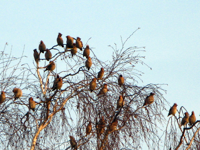 Bohemian WaxwingBohemian waxwings are non-territorial and often travel in flocks of 50-300 birds or more birds. They often appear in a spot with a good crop of berries. When they have eaten all the berries, they move on!