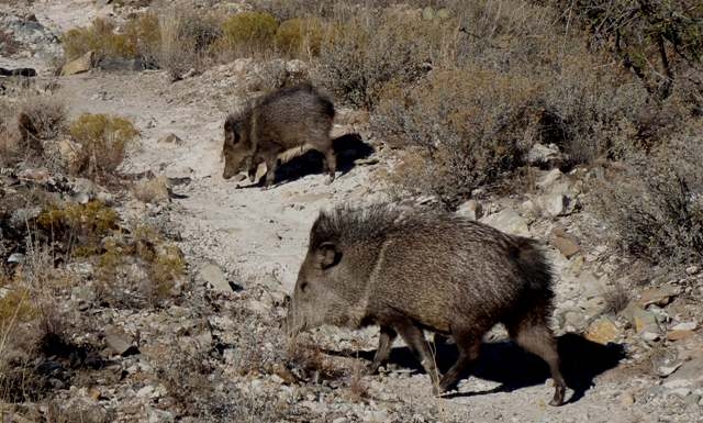 The collared peccary lives in brushy desert areas and rocky canyons. It is usually found near a water source.