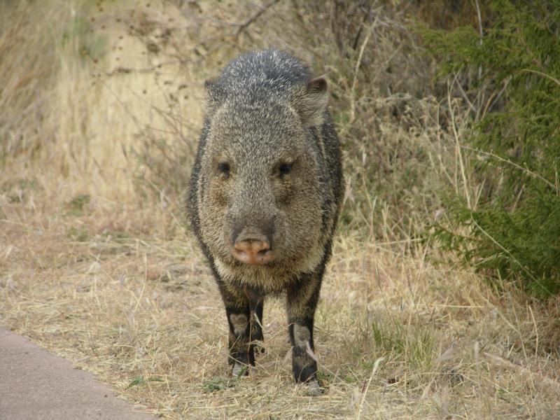 Collared PeccaryThe collared peccary has a pig-like snout, a large head and shoulders, and small legs with hoofed feet. It has grizzled and bristly gray and brown fur. It has a collar of white or yellowish fur around its neck and small, straight tusks. It is 2-3 feet in length and stands about 1.5-2 feet tall. It has a musk gland at the top of its rump. It uses its musk to identify members of its group and to mark its territory. It is sometimes called the javelina.