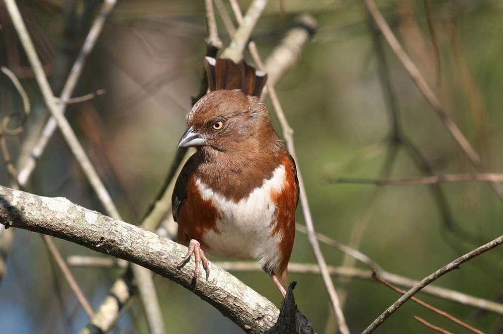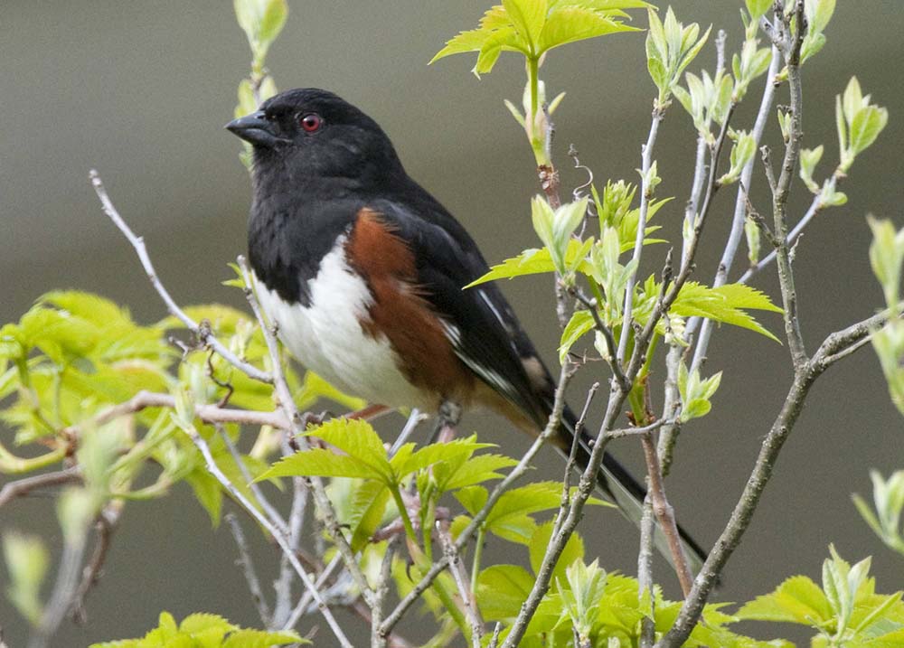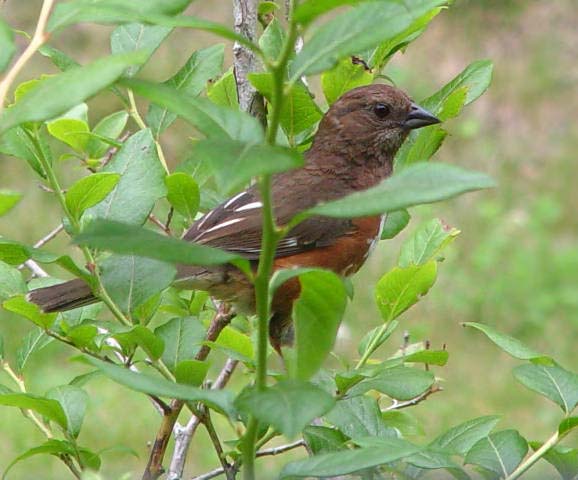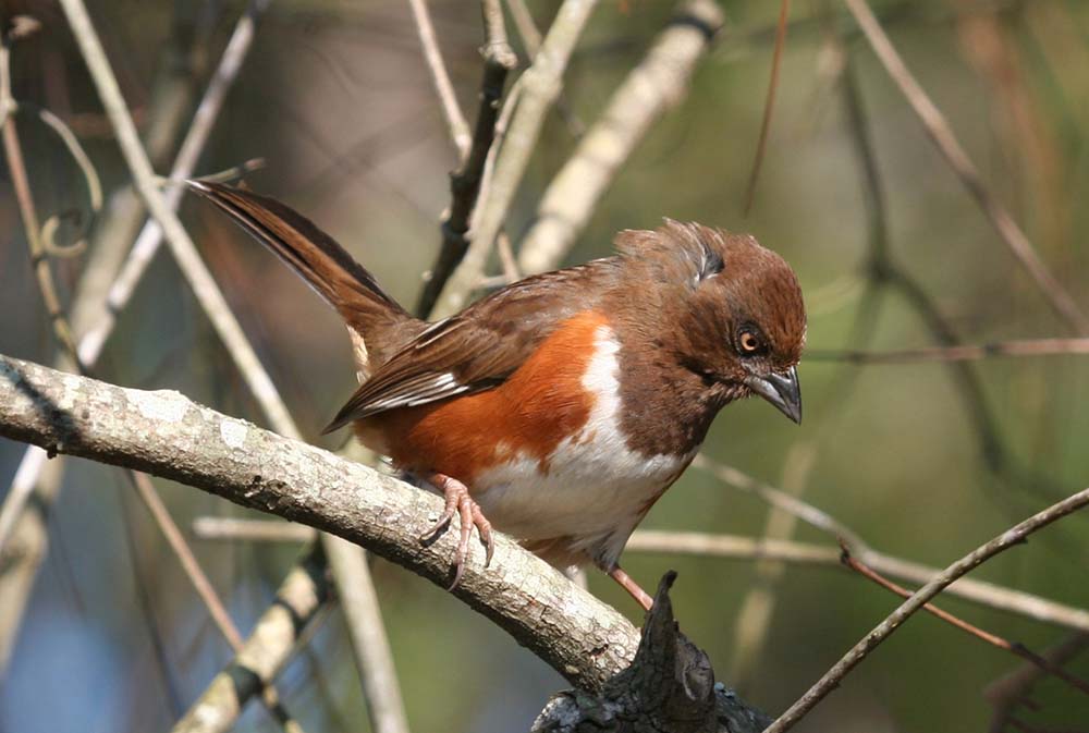 The eastern towhee lives in thickets and at the edges of brushy woodlands. |