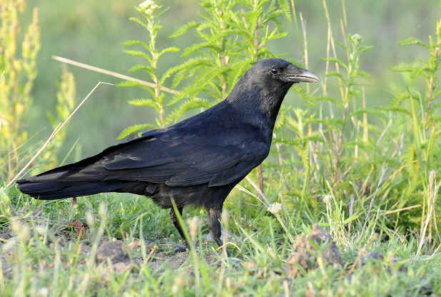 Fish CrowThe fish crow is around 15 inches in length. It is a glossy black with a squared-off to slightly rounded tail, a stout, pointed black bill with a slight hook at the end, and strong black legs and toes. It has stiff bristles over its nostrils. Males and females look alike. The fish crow is almost identical in looks to the American crow. It is slightly smaller and has a longer tail and longer wings, but the differences are very slight! In fact, the only way to easily tell them apart is by their calls. The American crow has a "caw caw" call, and the fish crow has a nasal "nyuh unh" call.