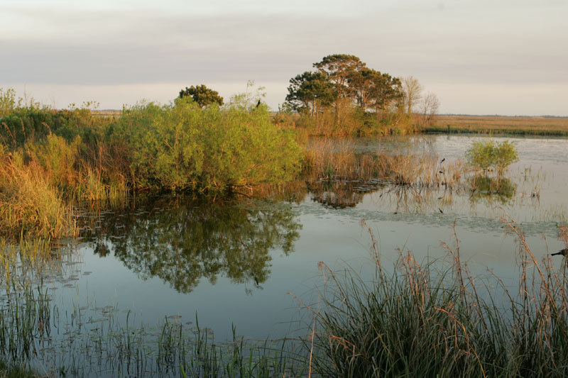 Low-growing plants like grasses and sedges are common in freshwater marshes. Bulrushes and cattails are often found at the edges of a marsh. There are very few trees in freshwater marshes. Animals like mink, raccoons, opossums, muskrats, beavers, frogs, turtles, and lots of species of birds and insects are common in marsh lands. Freshwater marshes can vary in size from very small to very large! The largest freshwater marsh in the United States is the Florida Everglades.