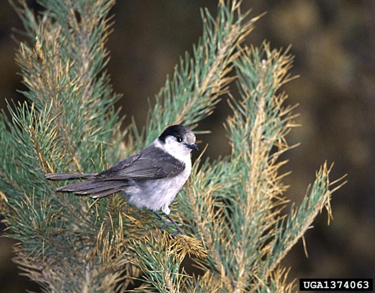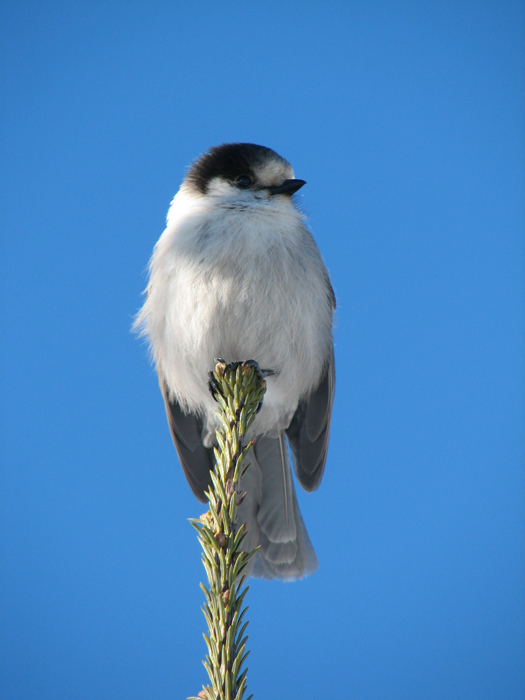 Gray JayThe Canada jay, also known as the gray jay, is about 10 inches in length. It is gray on top and grayish-white on its undersides. It has a white forehead and throat. It has a darker gray cap and nape and a short, dark bill.