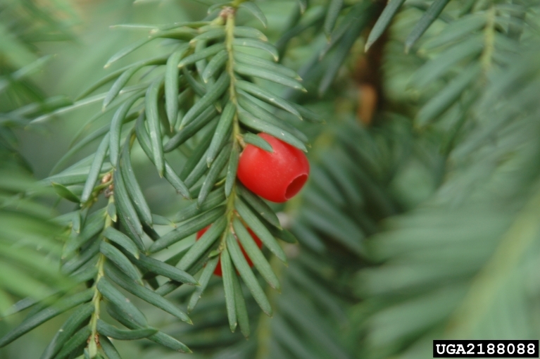english yewThe yew tree is a conifer that has its seed in a cup! The seed of the yew is in a red berry-like cup called an aril. The yew has long, straight, flat needles. The seeds of the yew can be toxic. Some birds eat the aril and leave the seed. The wood of the English yew was once used to make longbows!