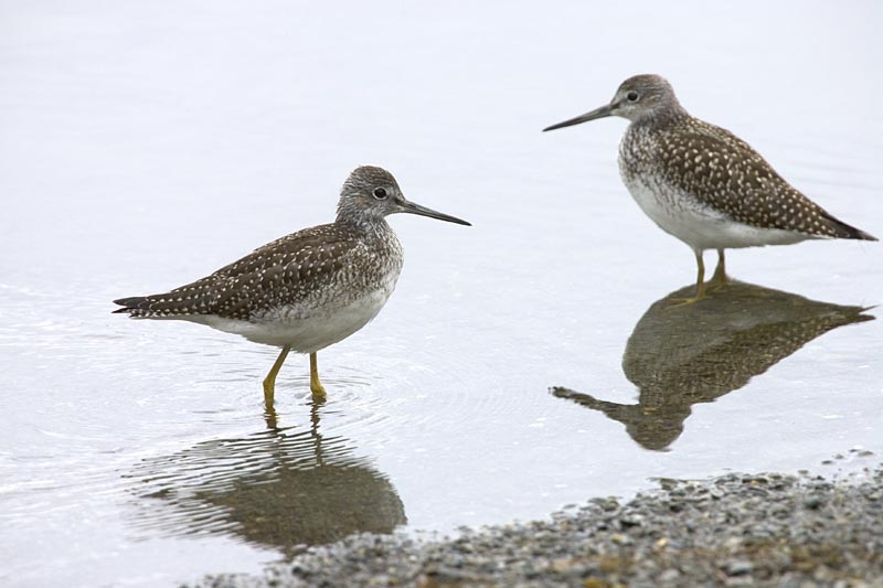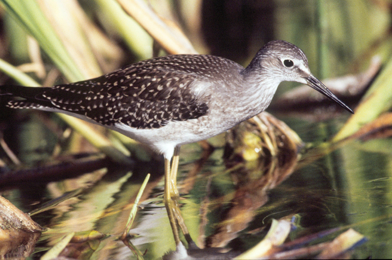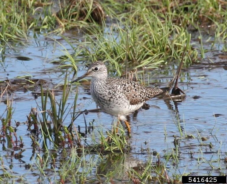 Lesser YellowlegsThe lesser yellowlegs is a medium sized shorebird that is nine to ten inches in length. It has a long, straight bill; a long neck; and a speckled brown body with a white belly and a gray rump. It gets its name from its very long, bright yellow legs. Males and females look alike.