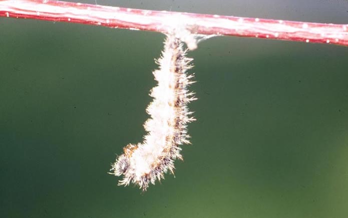Painted Lady The female painted lady lays single pale green eggs on host plants. The eggs hatch in 3-5 days. The caterpillar is purple to black in color and has yellow and green strips and is covered in spines. It pupates in 5-10 days. The painted lady butterfly emerges from the chrysalis in 7-10 days.