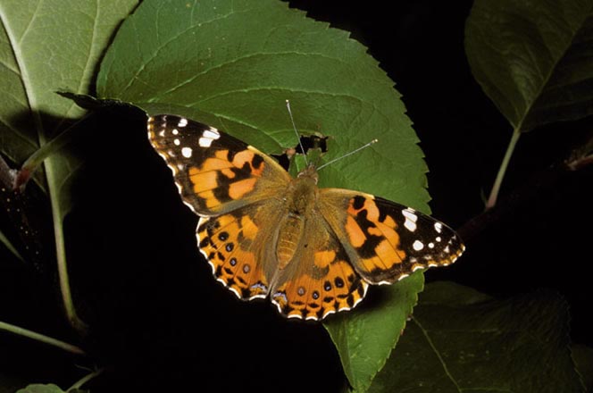 Painted LadyThe painted lady has a wingspan of 2-3 inches. It has scalloped orange wings with black patches. The tips of its forewings are black with white splotches. Its underside is a mottled gray, brown, and black with four eyespots. The painted lady is also called the thistle butterfly because it likes thistles and the cosmopolitan butterfly because it is found all over the world.