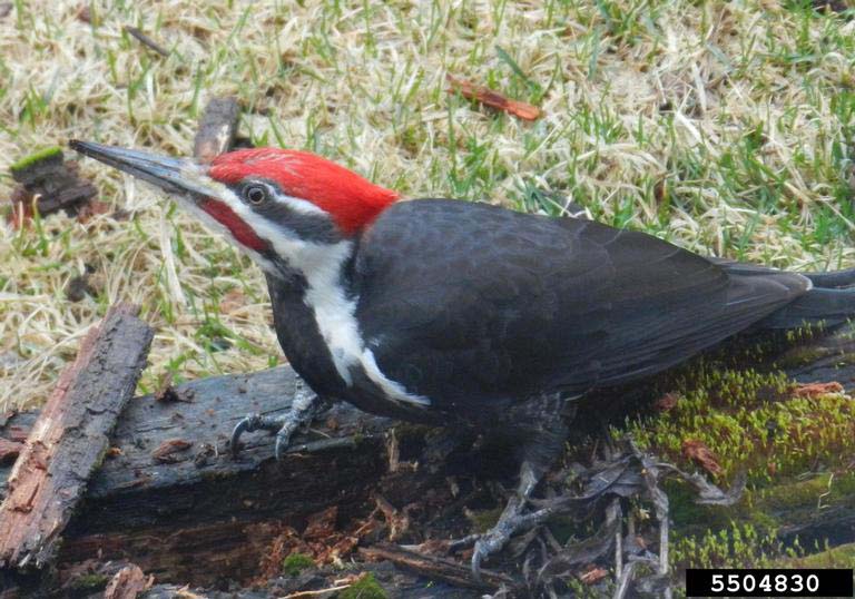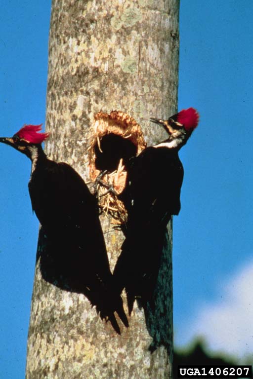 Pileated WoodpeckerAlthough the pileated woodpecker is adapted to clinging to the sides of trees, it is a strong flyer and it sometimes hops around on the ground. The pileated woodpecker "drums" on hollow trees with its bill to claim territory.