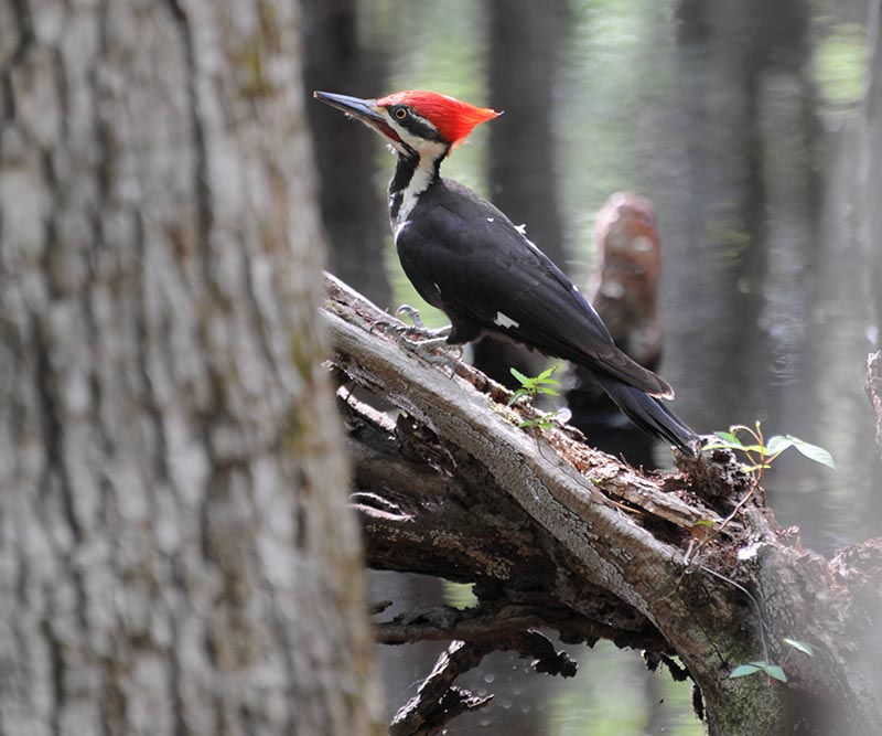The pileated woodpecker lives in coniferous and deciduous forests.