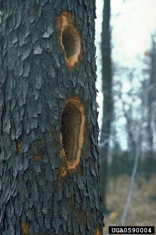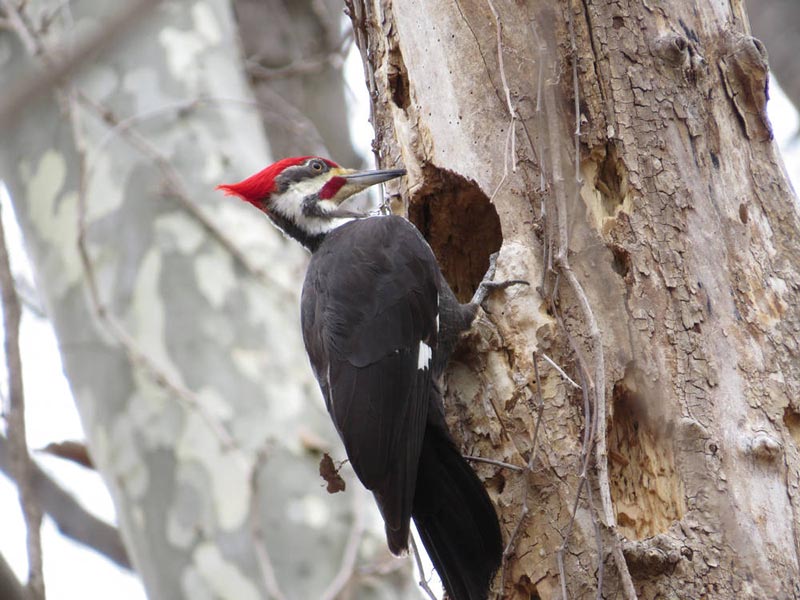Pileated WoodpeckerThe pileated woodpecker eats insects, fruits, and nuts. A large part of its diet is made up of carpenter ants and beetle larvae. It uses its sharp bill to pull bark off trees to expose ant colonies. It uses its long, sticky tongue to poke into holes and drag out the ants. It also digs out large rectangular holes in trees to create roosting and nesting spots and to expose insects!