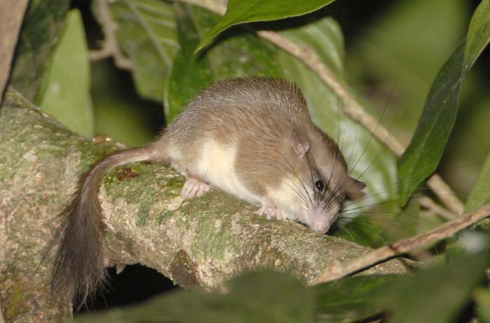 The Malabar spiny dormouse is found in old growth rainforests in southwestern India. It is nine inches in length. Four of those inches is its tail! It has soft brownish-gray fur and long pointed ears, It is nocturnal and spends most of its time in the trees. It lives in small family groups in tree cavities. It eats fruits and nuts.