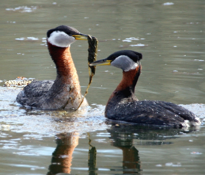 Red-necked GrebeThere are 22 species of diving birds in this family. Grebes are found fresh water lakes, ponds, and rivers around the world, except for in the polar regions. Some species winter along ocean coasts.
