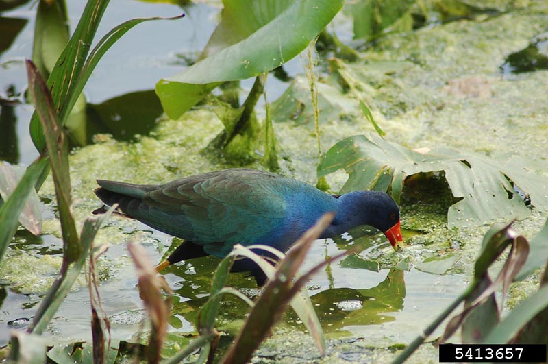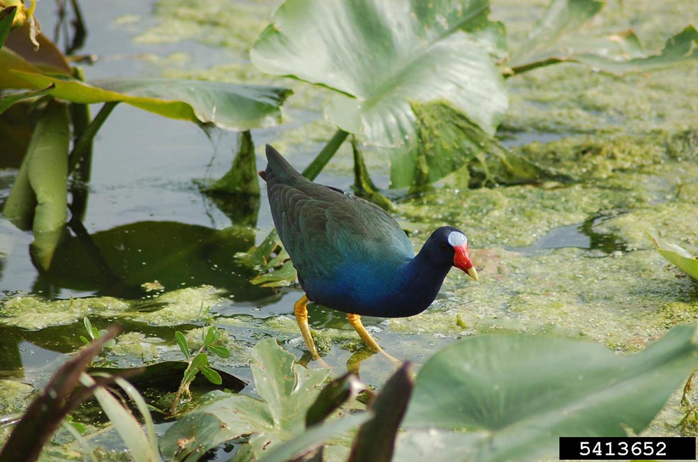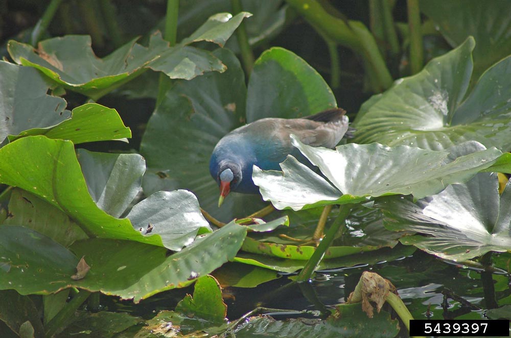 Purple GallinuleThe purple gallinule eats a wide variety of foods including frogs, grasshoppers, dragonflies, spiders and water plants.