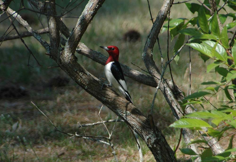 Red-headed WoodpeckerThe red-headed woodpecker is a small woodpecker, about 7-9 inches in length with a wingspan of 14-17 inches. It has a red head, neck, and upper breast. It has a white lower chest and stomach, black wings with a white patch on the back, and a black tail. It has a long, strong, sharp bill and black eyes. Males and females look alike.