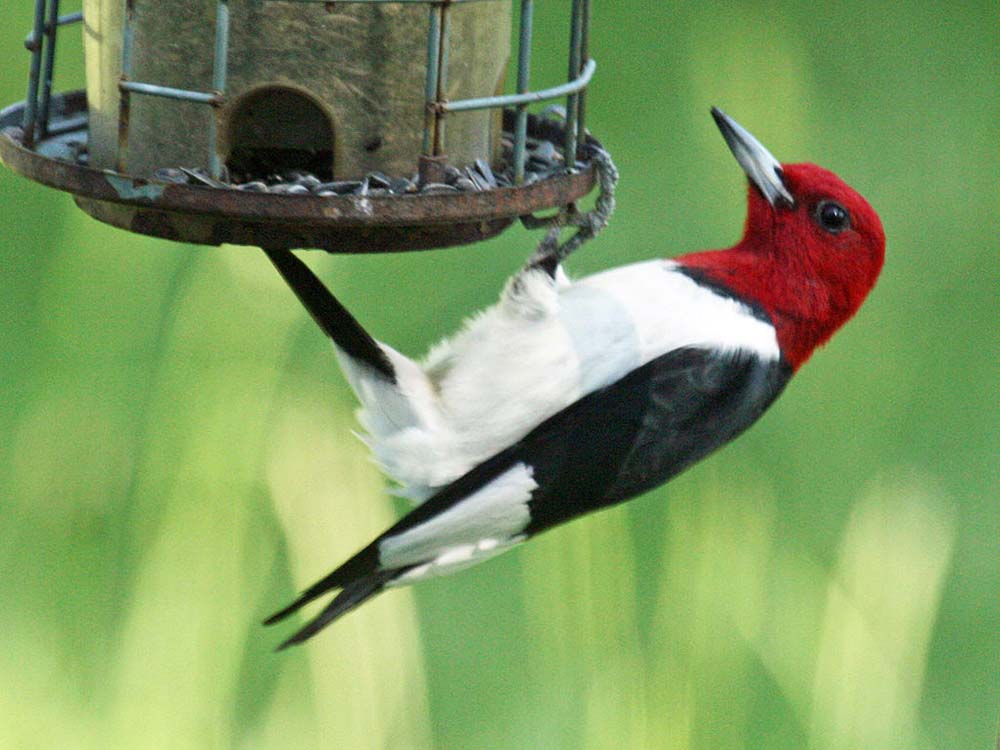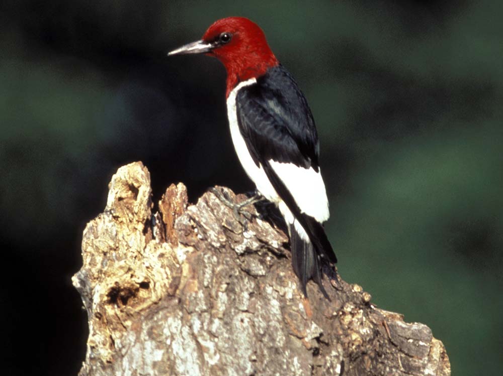 Red-headed WoodpeckerThe red-headed woodpecker is one of only four species of woodpecker that stores food. It hides food in crevices in trees, under the bark of trees, in fence posts, and even under shingles in roofs! The red-headed woodpecker may even wedge a live grasshopper or beetle into a crevice to eat later!
