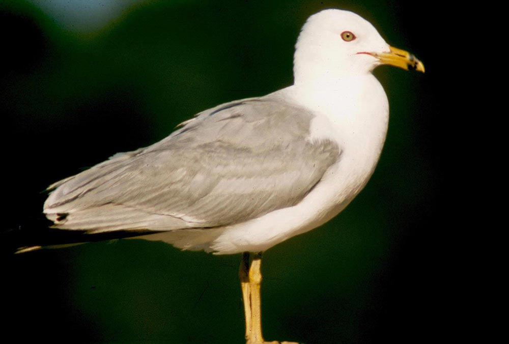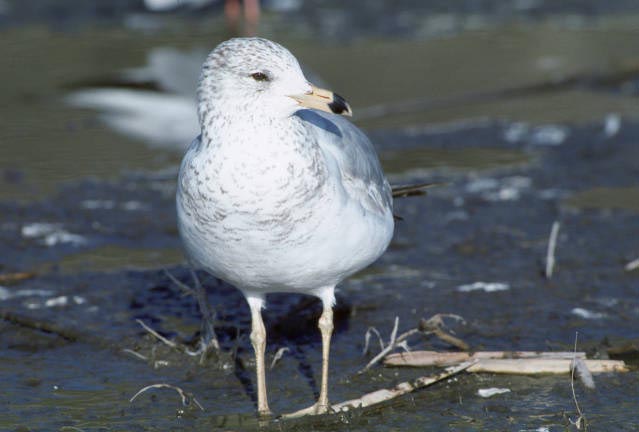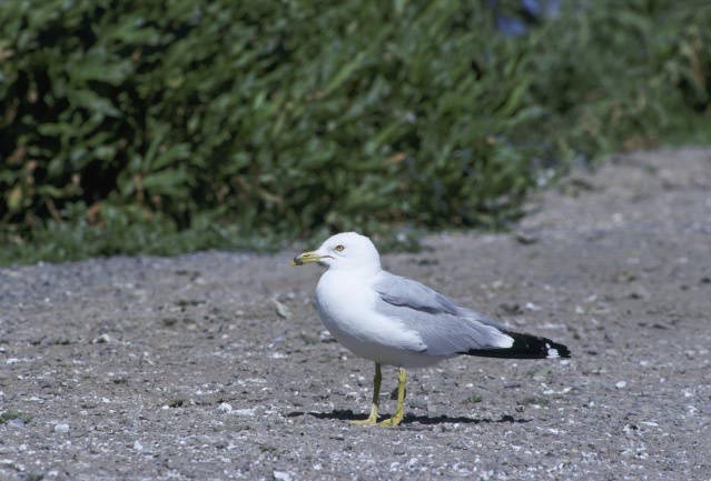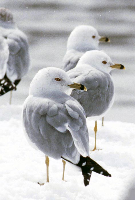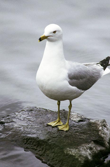 Ring-billed GullThe ring-billed gull is a medium-sized gull. It is about 16 inches in length and has a wingspan of about 4 feet. It has a short, bright yellow bill with a black ring at the tip. It has a white head, neck, chest, and belly and a soft gray back and upperwings.