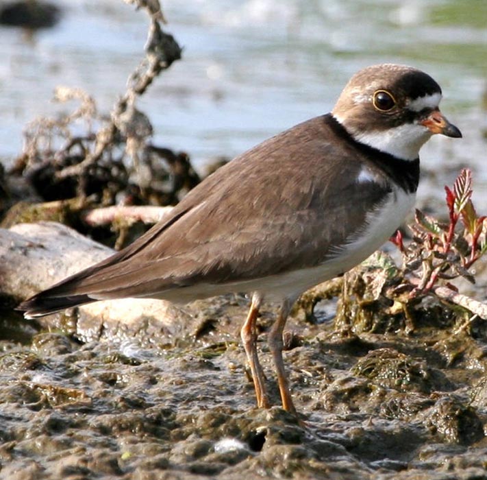 The semipalmated plover is about seven inches in length. It has a brown back and white undersides. It has a white neck and throat with a black band around it and orange legs and feet. Its black bill has an orange band around it. The semipalmated plover has a black band on the top of its head, white "eyebrows" and a white patch between its eyes.