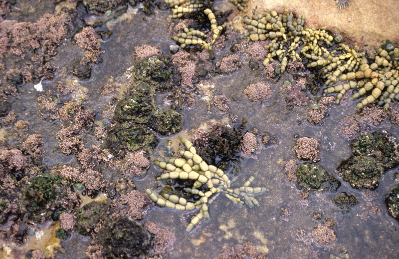 Intertidal RainforestIf the spray zone is the desert of the intertidal zone, the low tide zone or intralittoral fringe is the rainforest. It is usually covered by water for most of the day. It is only exposed to air during unusually low tides. Because there is less change, life is easier for the organisms in this zone and there are more species here than in the other zones. Lots of species of seaweed, crabs, sea urchins, star fish, anemones, and small fish are common here.