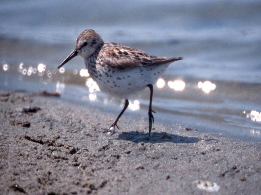 Western SandpiperThe western sandpiper is very similar in appearance to the semipalmated sandpiper. It is 6-7 inches in length and has a wingspan of 10-15 inches. It has white undersides, a long bill with a little droop at the end, long legs, and slightly webbed feet. In the summer, its crown and upper back are a rusty brown. It has a black line on its rump that runs to its tail. In the winter, its crown and upper back are gray. Males and females look alike, but the female is a little larger and has a slightly longer bill.