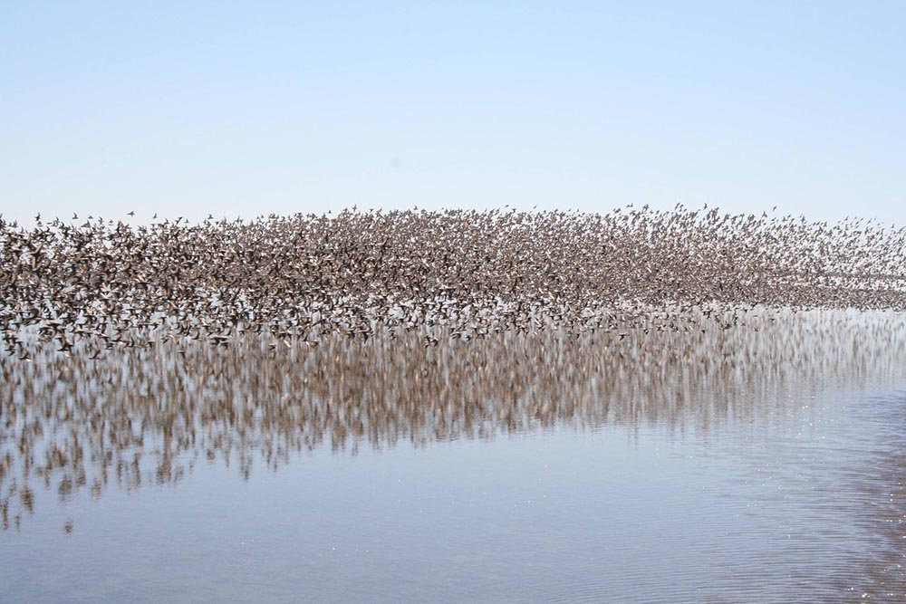 Western SandpiperDuring migration, the western sandpiper may gather in large flocks made up of hundreds of birds.