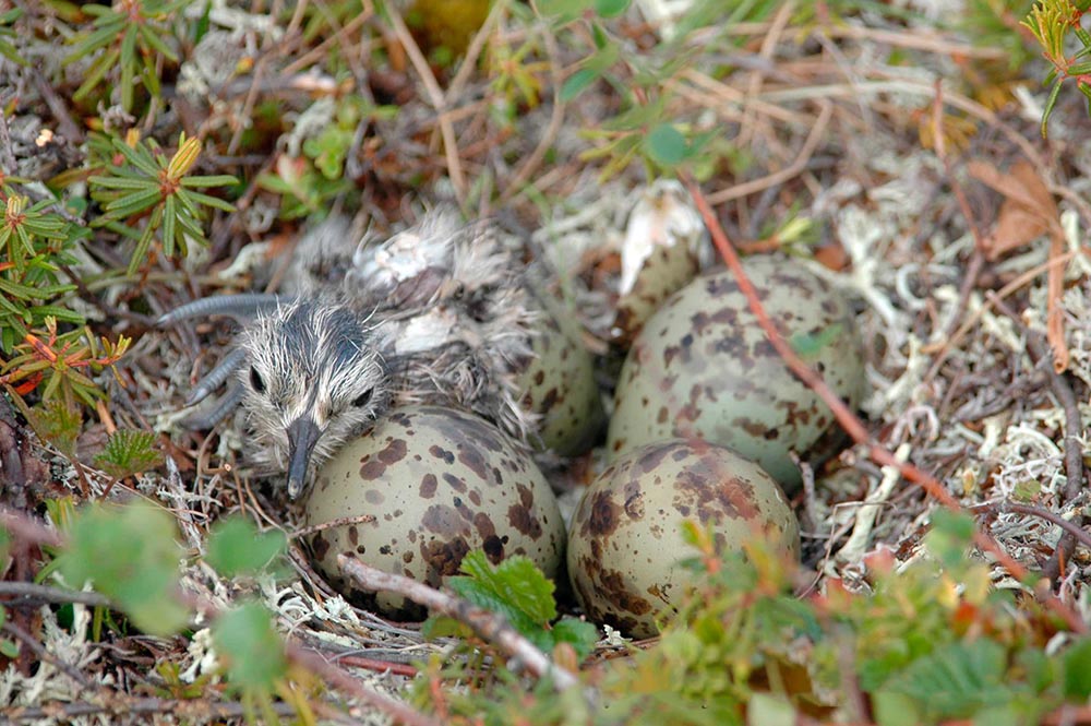WhimbrelThe male whimbrel flies in circles over the breeding territory and sings as he tries to attract a mate. The female lays 3-5 eggs in a depression on the ground that is lined with moss, grass, and lichen. Both parents incubate the eggs. Incubation takes 27-28 days. The chicks leave the nest and feed themselves shortly after they are born. Both parents care for the chicks until they fledge 34-42 days after hatching.